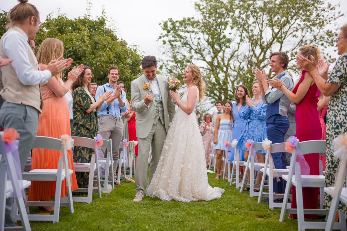 Fantastisch als het kan; de hele dag rondom het huis van ouders je bruiloft vieren. Floor en Gigi doen dat. Een uitstekende keuze, want dat scheelt verplaatsingen en brengt rust in het schema. Op het veld naast het huis verrijzen de eerste tentjes; verschillende gasten blijven kamperen. Het geheel ademt een ontspannen festivalsfeer, duidelijk het resultaat van zorgvuldige voorbereiding. De fotoshoot is in de ochtend al gedaan door een goede vriendin, dus wanneer wij arriveren treffen we een bruidspaar dat […]